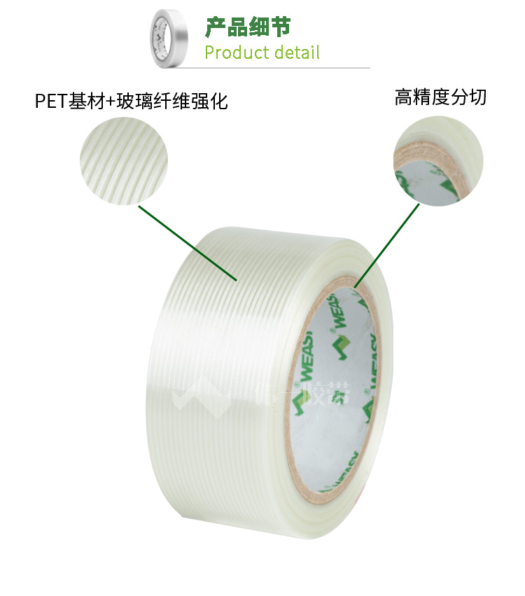 纖維膠帶是由高強度的玻璃纖維紗和強化背材復合PET薄膜,再單面涂上壓敏膠粘劑組成,高粘或低粘都如此制做。一般市場上的膠帶,都可以分為條紋和網(wǎng)格兩種類型,條紋就是一條條,整齊狀的,被稱為條紋纖維膠帶。網(wǎng)格就是像網(wǎng)一樣,一格格狀的,被稱為網(wǎng)格纖維膠帶。